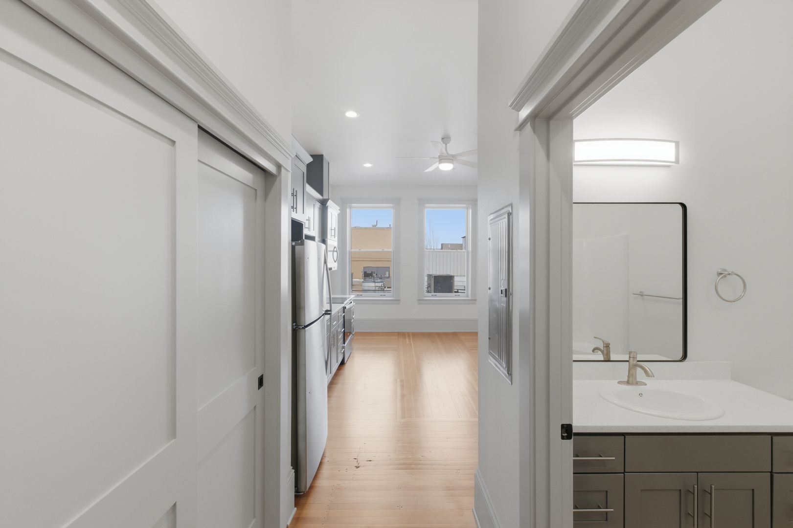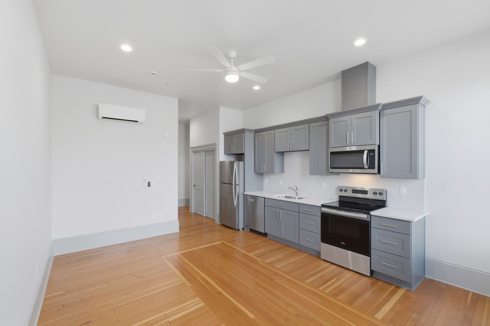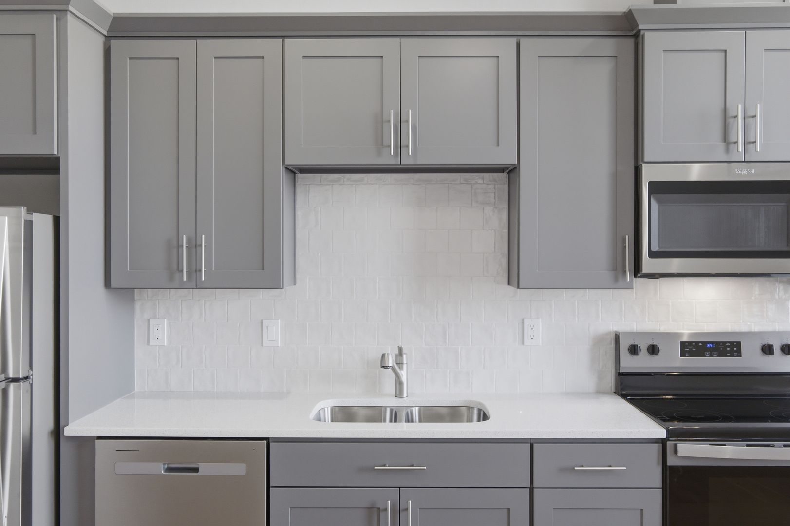 Modern stainless steel appliances, quartz countertops, tile backsplash in the kitchen, and real hardwood floors make Court Street Apartments an appealing place to call home.