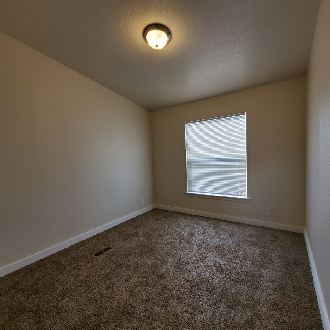 Pet friendly 4 bedroom, 2 bathroom home has an open kitchen with an island, a garage, and a fenced back yard. Natural gas furnace, range, and water heater. Air conditioning included.